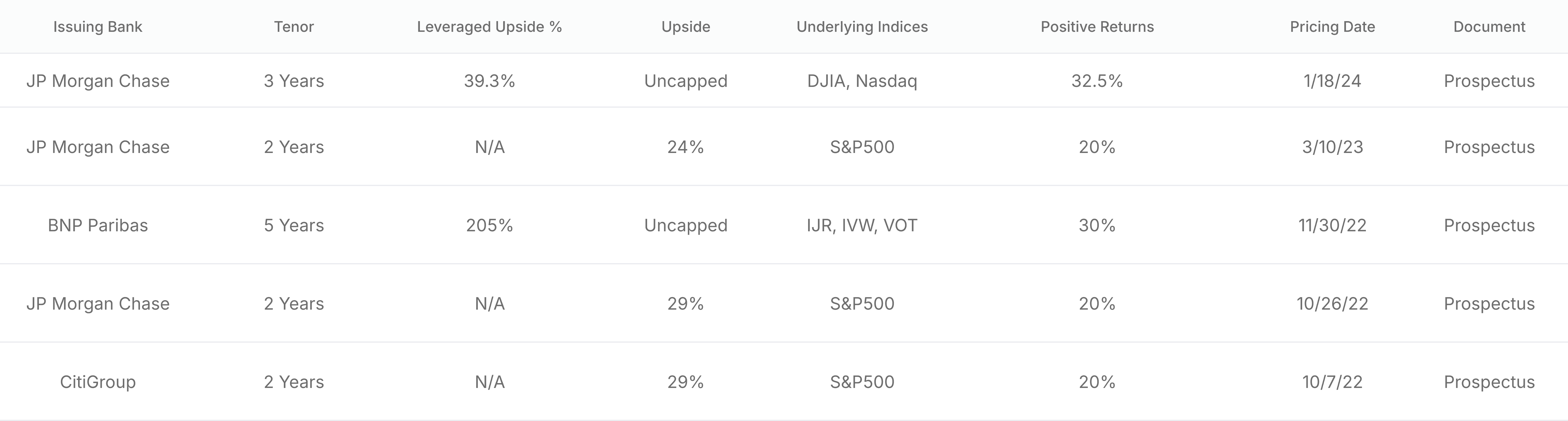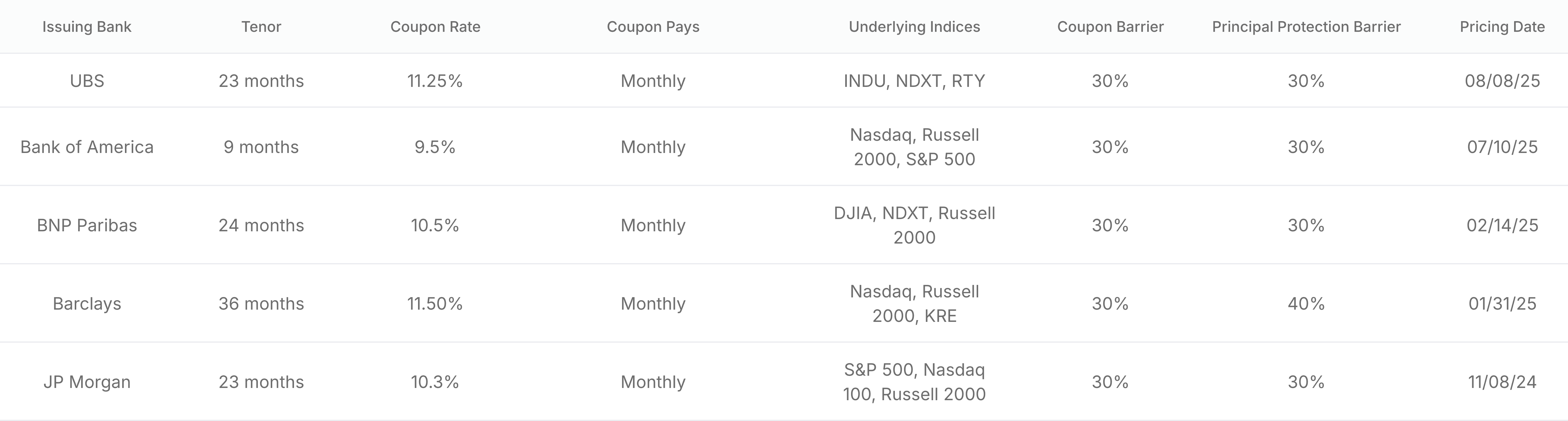 Explore real-world structured note offerings that Claro Advisors has brought to our clients. These past deals help illustrate how structured solutions are designed to deliver income, growth participation, or tailored outcomes across different market environments. All offerings below were exclusive to Registered Investment Advisor (RIA) and Claro Advisors clients.